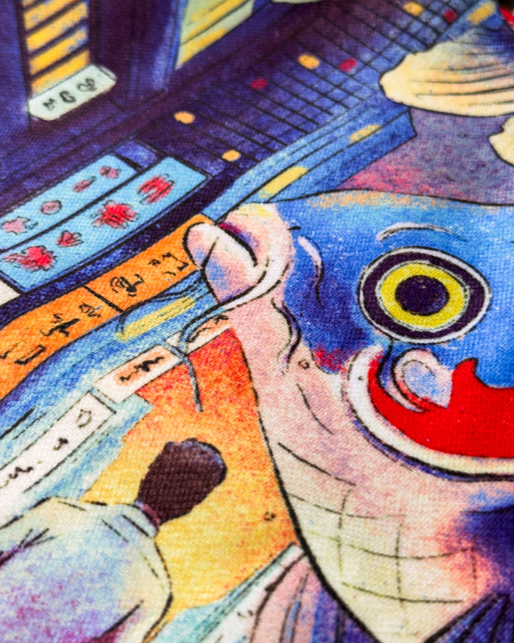 El diseño original ha sido trasladado a una impresión textil de alta calidad sobre una suave tela de terciopelo.