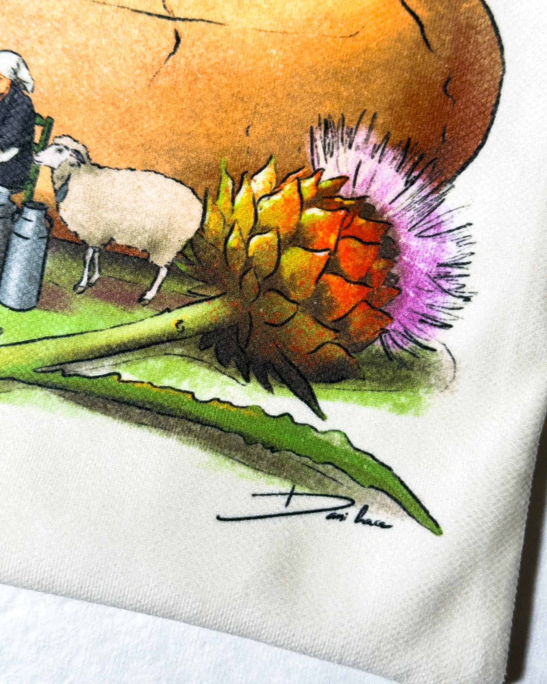 El diseño original ha sido trasladado a una impresión textil de alta calidad sobre una suave tela de terciopelo.